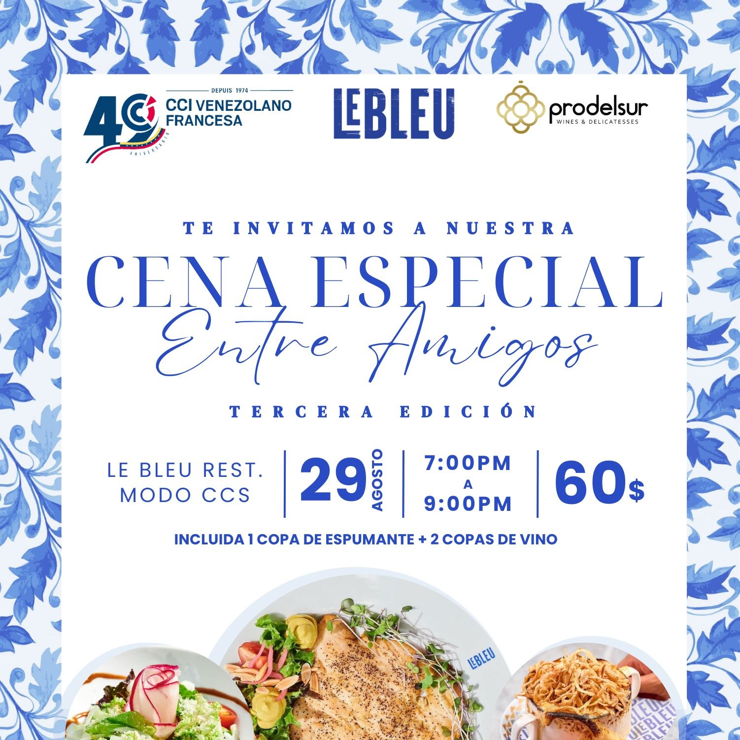 La CCIAVF se complace en invitar a sus afiliados a la tercera edición de nuestra "Cena Especial Entre Amigos", la cual se llevará a cabo en el Restaurant Francés @lebleuccs, el próximo 29 de agosto con una inversión de 60$.