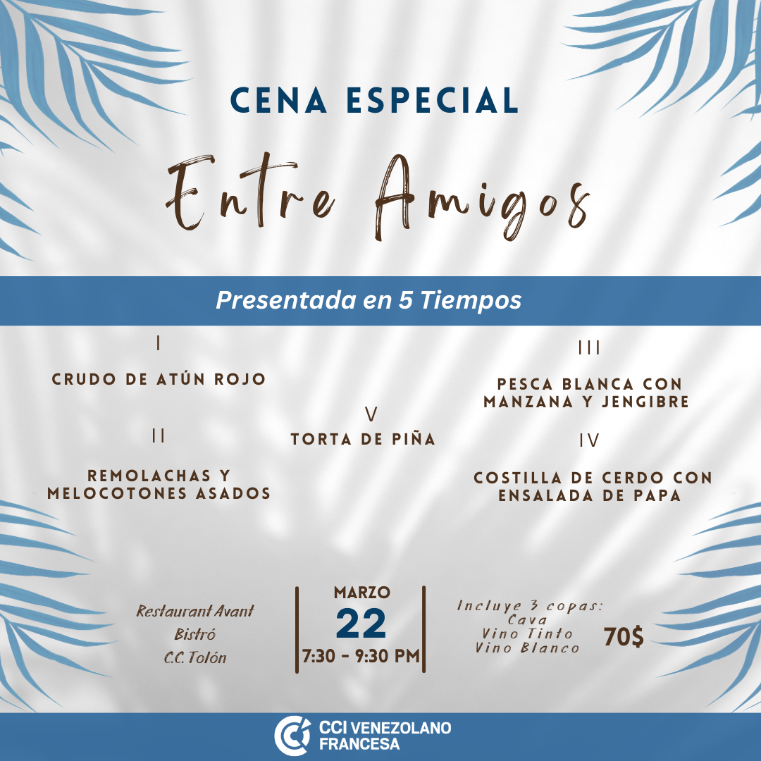 La CCIAVF se complace en invitarle a disfrutar de una "Cena Especial entre Amigos", una actividad gastronómica presentada en 5 tiempos en donde podrá deleitar su paladar con estas exquisitas preparaciones: