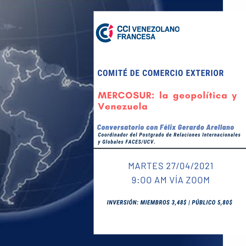 La CCIAVF tiene el agrado de invitarte a participar el martes 27 de abril en el conversatorio de nuestro Comité de Comercio Exterior: “MERCOSUR: la geopolítica y Venezuela", el cual estará a cargo del Sr. Félix Gerardo Arellano, Coordinador del Postgrado de Relaciones Internacionales y Globales de FACES/UCV.