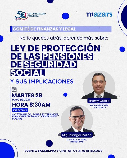El próximo Martes 28 de mayo, llevaremos a cabo nuestro Comité de Finanzas y Legal el cual estará a cargo de Thomy Céfalo (Socio Asesoría Tributaria) y Miguelangel Molina (Gerente Senior de Impuestos) de Mazars (Miembro activo de la CCIAVF) quienes brindarán información de calidad sobre la nueva Ley de Protección de las Pensiones de Seguridad Social y sus implicaciones.