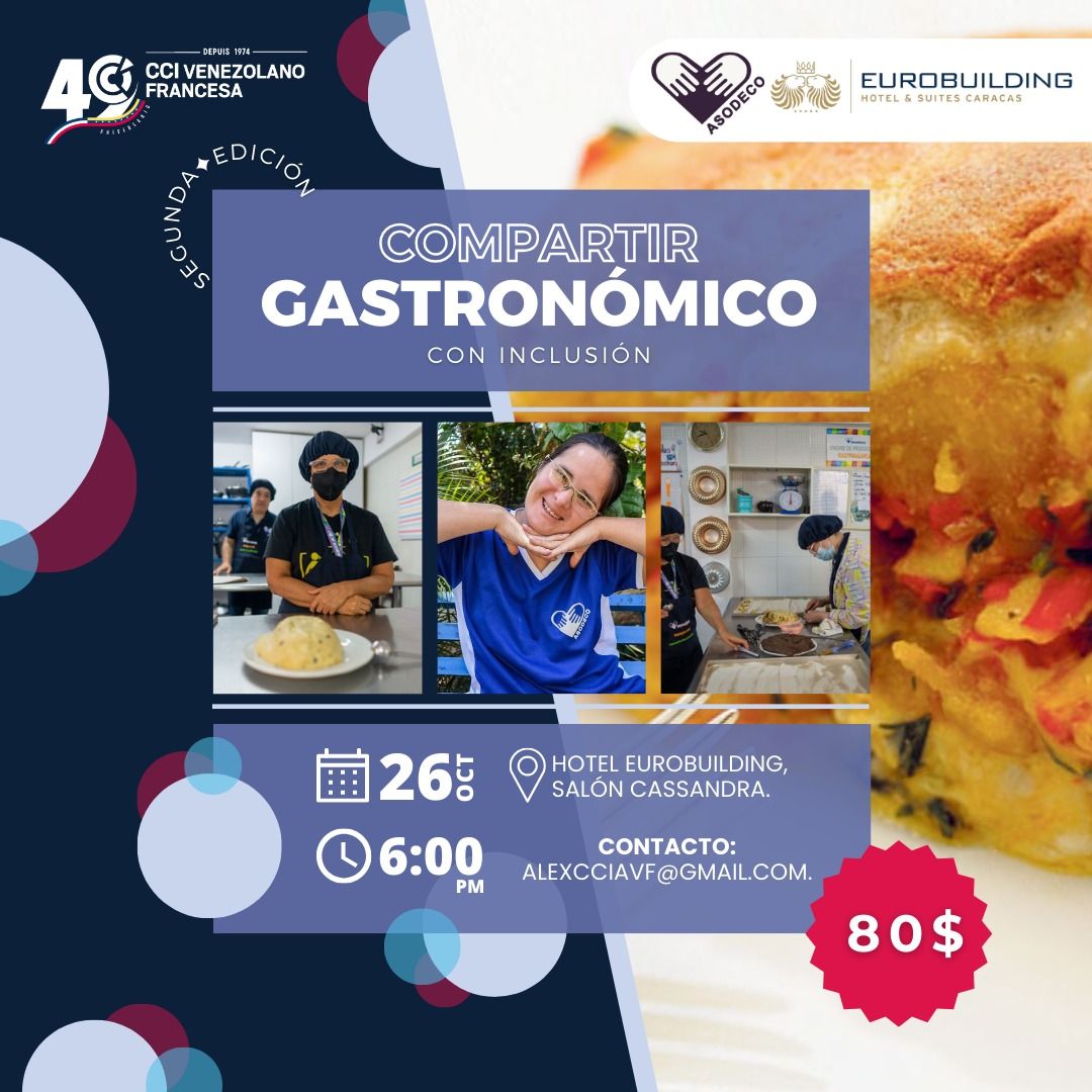 En el marco de responsabilidad social empresarial de La Cámara de Comercio Venezolano Francesa, hemos organizado conjuntamente con @Asodeco y @Eurobuilding un "Compartir Gastronómico con Inclusión", actividad que tiene como objetivo la recaudación de fondos en beneficio de jóvenes y adultos en educación, formación e inclusión laboral.
