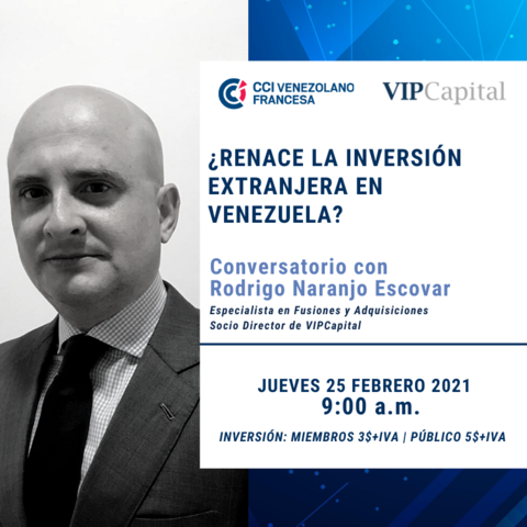 La CCIAVF tiene el placer de invitarte a participar en el Conversatorio "¿Renace la inversión extranjera en Venezuela?" con el Sr. Rodrígo Naranjo Escovar, Especialista en Fusiones y Adquisiciones y Socio Director de VIPCapital.