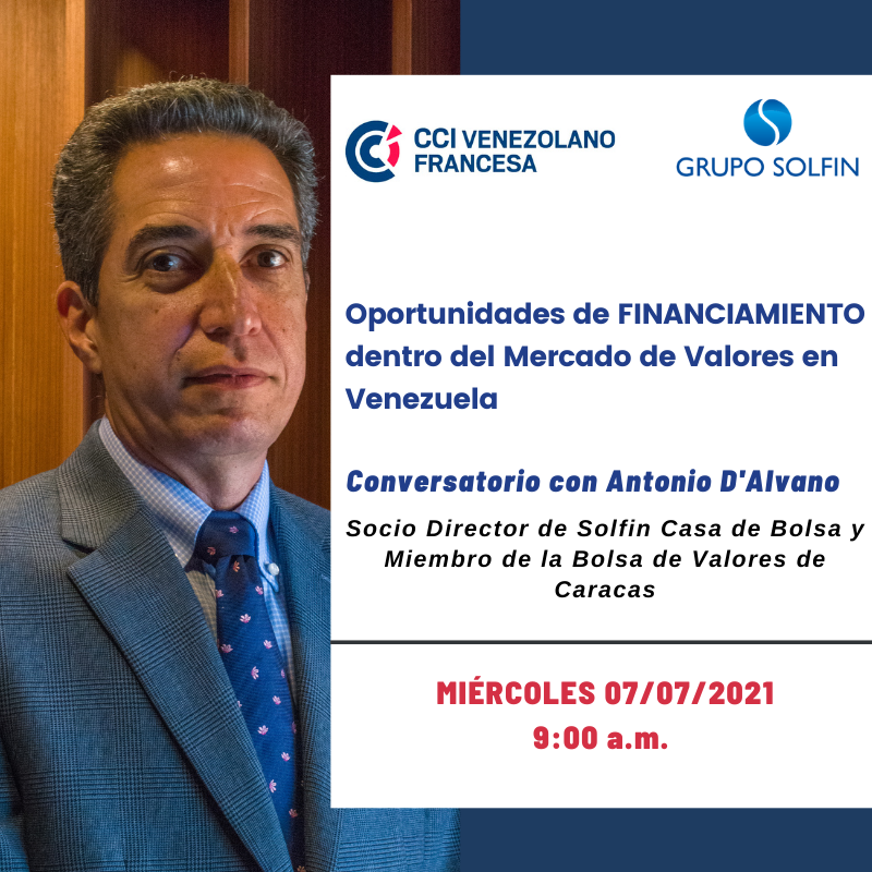 La CCIAVF se complace en invitarte a participar el miércoles 07 de julio en el Conversatorio: Oportunidades de Financiamiento dentro del Mercado de Valores en Venezuela, con la presentación del Economista Antonio D'Alvano.