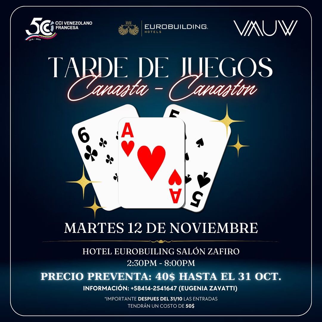 En el marco de cumplimiento de la Responsabilidad Social Empresarial, la CCIAVF tiene el placer invitarlos a nuestro evento: “Tarde de Juegos: Canasta y Canastón” a beneficio de la Asociación VAAUW, quienes desde hace 76 años se dedican a colaborar con la educación de niños y jóvenes venezolanos.