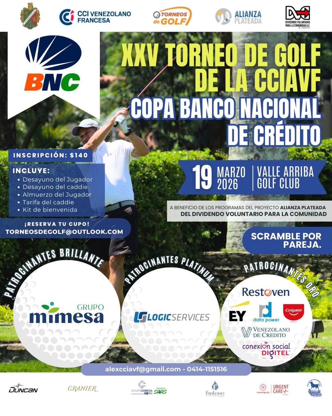 El torneo se estará realizando el jueves 19 de marzo de 2026 en los campos del Valle Arriba Golf Club.