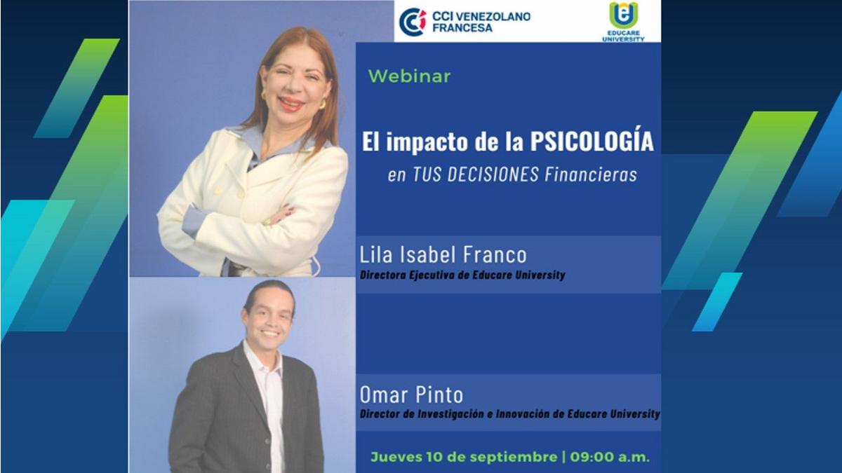 El pasado jueves 10 de septiembre estuvimos realizando el webinar "El impacto de la psicología en tus decisiones financieras", un ameno encuentro online en donde disfrutamos de la participación especial de Lila Isabel Franco y Omar Pinto, de Educare University.