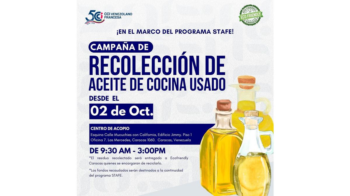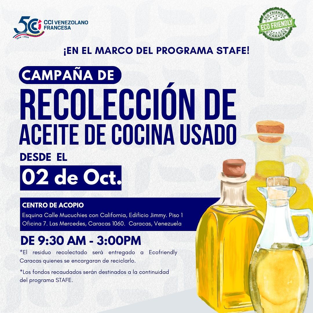 Por ello, en el marco del 50 aniversario de la Cámara y del programa STAFE, la Cámara de Comercio, Industria y Agricultura Venezolano Francesa (CCIAVF) se ha aliado con Ecofriendly Caracas para llevar a cabo una importante campaña de recolección de residuos de aceite vegetal.