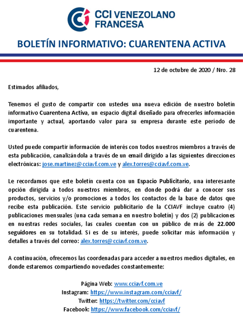 Cuarentena Activa es una publicación digital de frecuencia semanal que nace con el objetivo de convertirse en una ventana informativa para nuestros lectores, en donde encontrarán información y detalle de nuestros eventos y actividades en línea, noticias de actualidad nacional e internacional, curiosidades e información de apoyo y publicidad de nuestros afiliados.