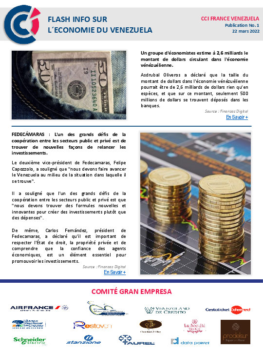 Flash Info Sur L'Economie du Venezuela es una publicación digital de frecuencia mensual que nace con el objetivo de convertirse en una ventana informativa para nuestros lectores, en donde podrán encontrar las noticias más destacadas del acontecer comercial en Francia, Venezuela y el mundo.