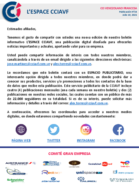 L'Espace CCIAVF es una publicación digital de frecuencia semanal que nace con el objetivo de convertirse en una ventana informativa para nuestros lectores, en donde encontrarán información y detalle de nuestros eventos y actividades en línea, noticias de actualidad nacional e internacional, curiosidades e información de apoyo y publicidad de nuestros afiliados.
