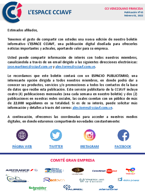 L'Espace CCIAVF es una publicación digital de frecuencia semanal que nace con el objetivo de convertirse en una ventana informativa para nuestros lectores, en donde encontrarán información y detalle de nuestros eventos y actividades en línea, noticias de actualidad nacional e internacional, curiosidades e información de apoyo y publicidad de nuestros afiliados.