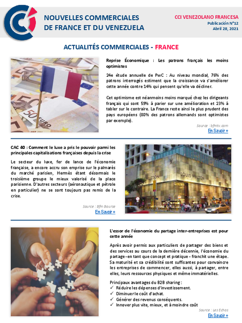 Nouvelles Commerciales de France et du Venezuela es una publicación digital de frecuencia mensual que nace con el objetivo de convertirse en una ventana informativa para nuestros lectores, en donde podrán encontrar las noticias más destacadas del acontecer comercial en Francia, Venezuela y el mundo.