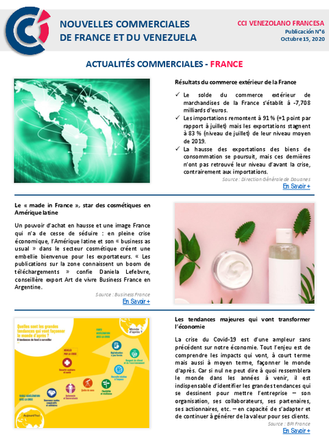 Nouvelles Commerciales de France et du Venezuela es una publicación digital de frecuencia mensual que nace con el objetivo de convertirse en una ventana informativa para nuestros lectores, en donde podrán encontrar las noticias más destacadas del acontecer comercial en Francia, Venezuela y el mundo.